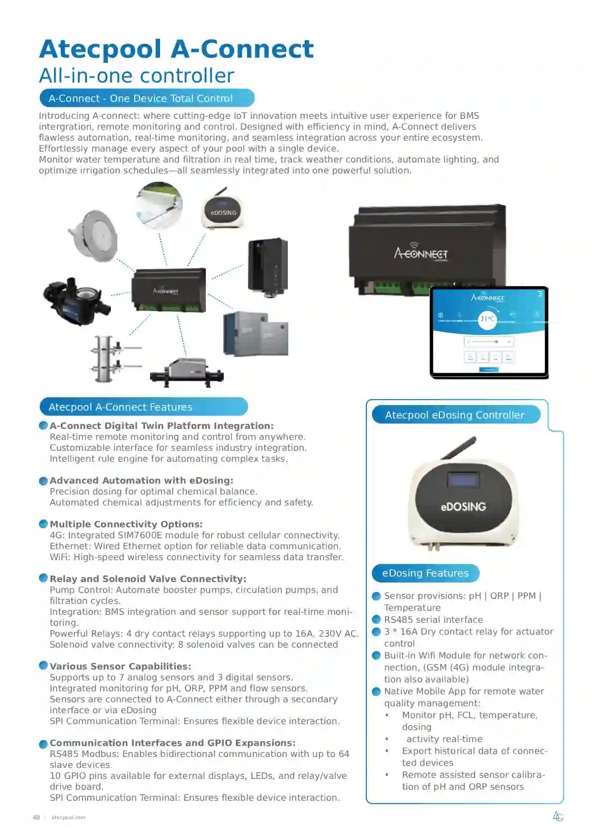 Precision dosing for optimal chemical balance. Automated chemical adjustments for efficiency and safety. - Multiple Connectivity Options: 4G: Integrated SIM7600E module for robust cellular connectivity. Ethernet: Wired Ethernet option for reliable data communication. WiFi: High-speed wireless connectivity for seamless data transfer.