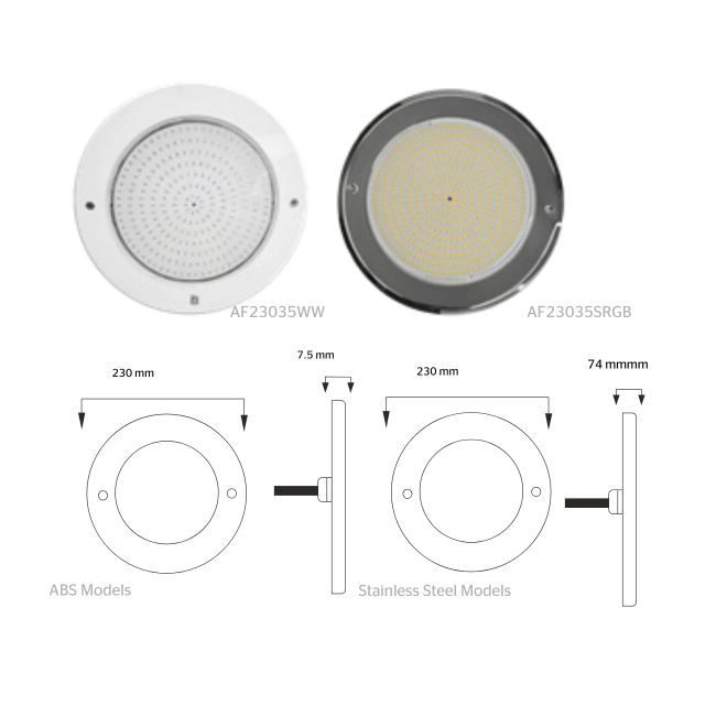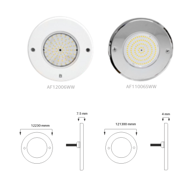 230 mm Ø available in 18W (252 LED) / 25W (324 LED) and 35W (432 LED) output. Ultra Thin ABS LED 230 mm Ø / 7.5 mm thickness. Ultra Thin SS AISI 316 LED 230 mm Ø / 4 mm thickness.