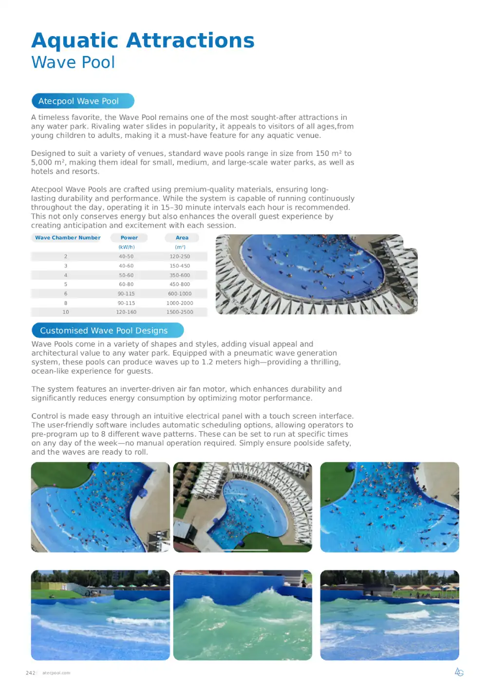 A timeless favorite, the Wave Pool remains one of the most sought-after attractions in any water park. Rivaling water slides in popularity, it appeals to visitors of all ages,from young children to adults, making it a must-have feature for any aquatic venue. Designed to suit a variety of venues, standard wave pools range in size from 150 m² to 5,000 m², making them ideal for small, medium, and large-scale water parks, as well as hotels and resorts. Atecpool Wave Pools are crafted using premium-quality materials, ensuring longlasting durability and performance. While the system is capable of running continuously throughout the day, operating it in 15–30 minute intervals each hour is recommended. This not only conserves energy but also enhances the overall guest experience by creating anticipation and excitement with each session.