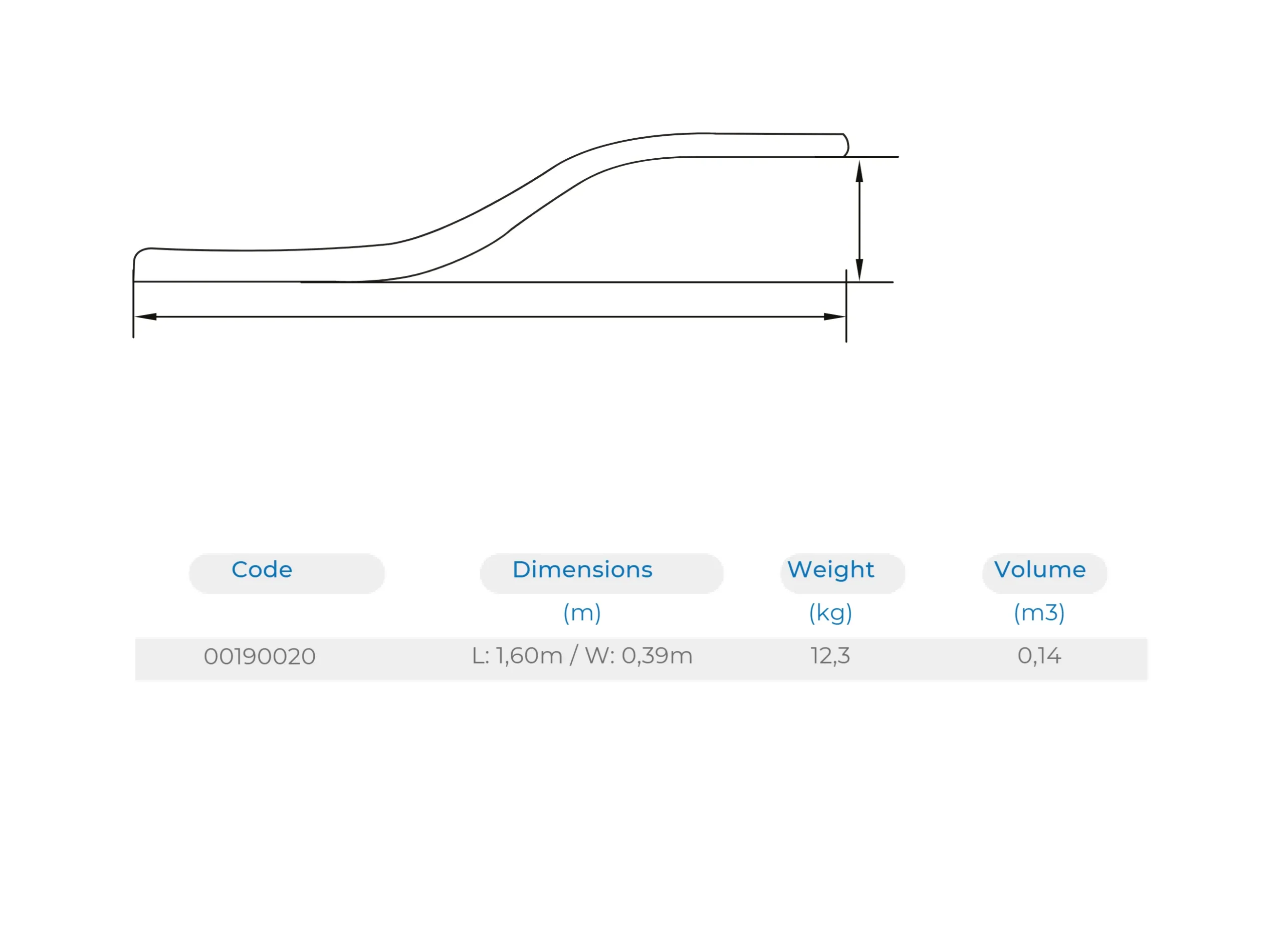 Diving board made of fiberglass and polyester with anchoring fixtures. Non slip surface with extra strips for the diving area at the end of the board. Length 1.6 m. Width 0.39 m